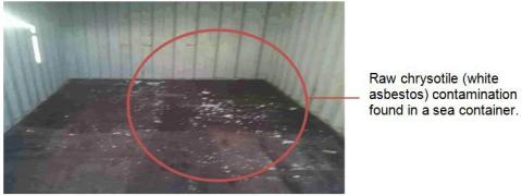 Sea containers are used to transport raw mined asbestos to countries that continue to use asbestos in manufacturing processes. Empty sea containers are regularly transported to Australia for further use. Many countries do not have strict quarantine laws. As a result sea containers may not be cleaned prior to arrival into Australia and may be contaminated.